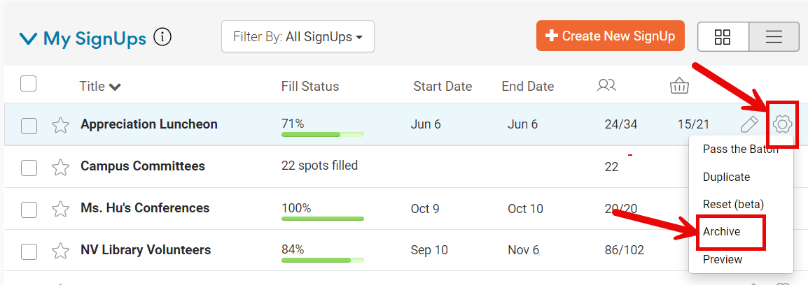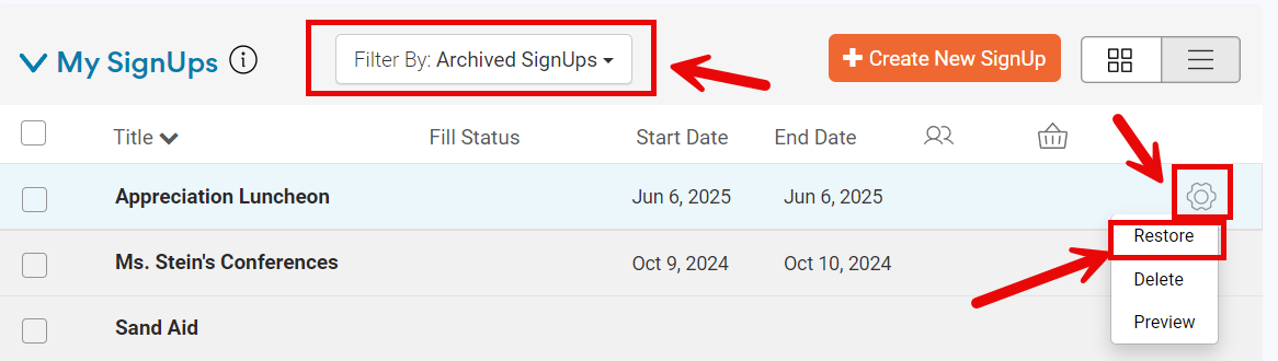 If you wish to Delete or Restore an Archived SignUp, first, set the Filter By menu to Archived SignUps. In this view you have the option to Delete or Restore your SignUp by clicking the gear icon (⚙️) and selecting your action.
