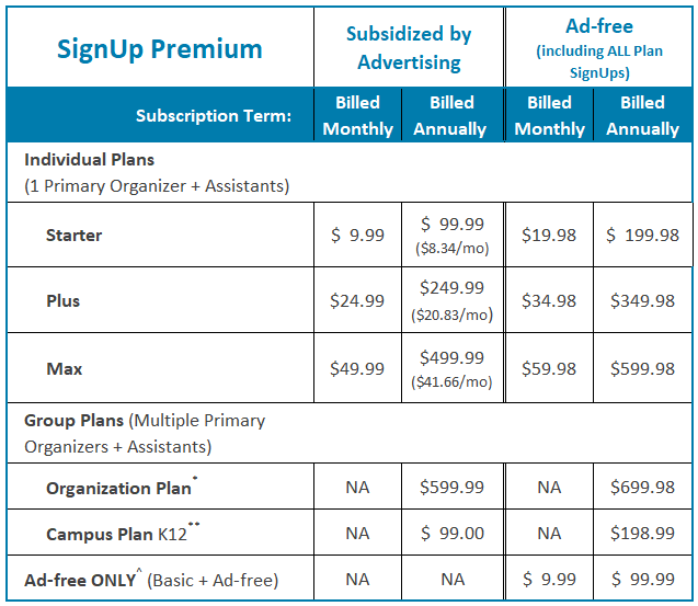 ** The Campus Plan is ONLY for K-12 Schools and School-Parent Groups providing up to 150 Max-level Premium Organizer 'seats' all connected for reporting purposes. Learn more here.