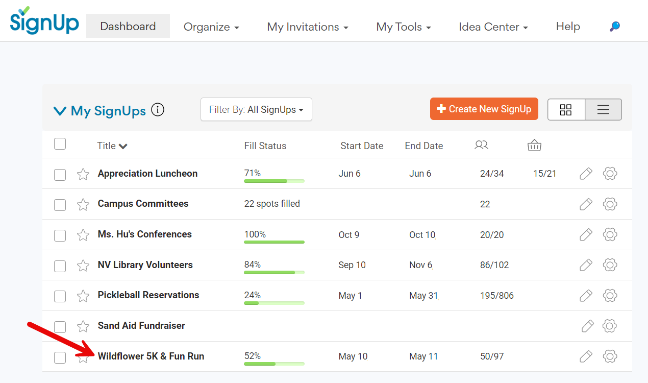 - Use the Filter By pull-down menu (large-screen only) to show All your SignUps, Past SignUps, Favorites, or Archived SignUps.