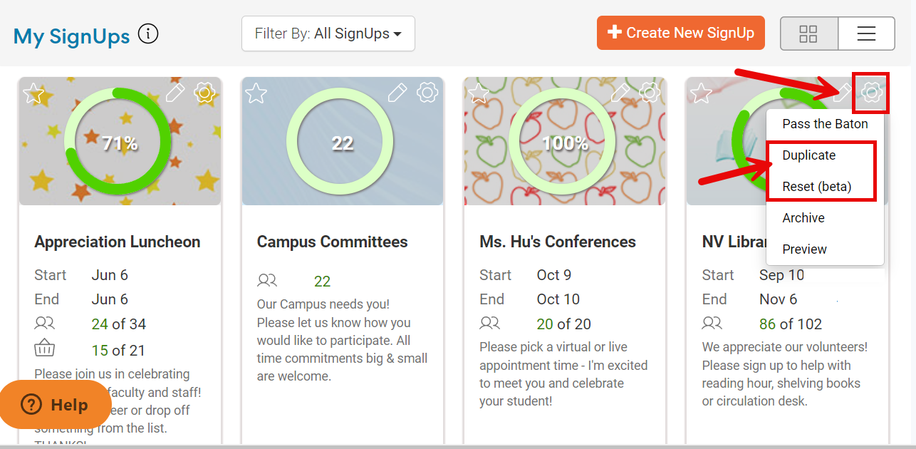 If you have multiple years planned on the past SignUp, do NOT use Duplicate, unless you delete all but one year of Spots. If you need to delete a previous year's dates first, please see: How do I delete days with in my SignUp?