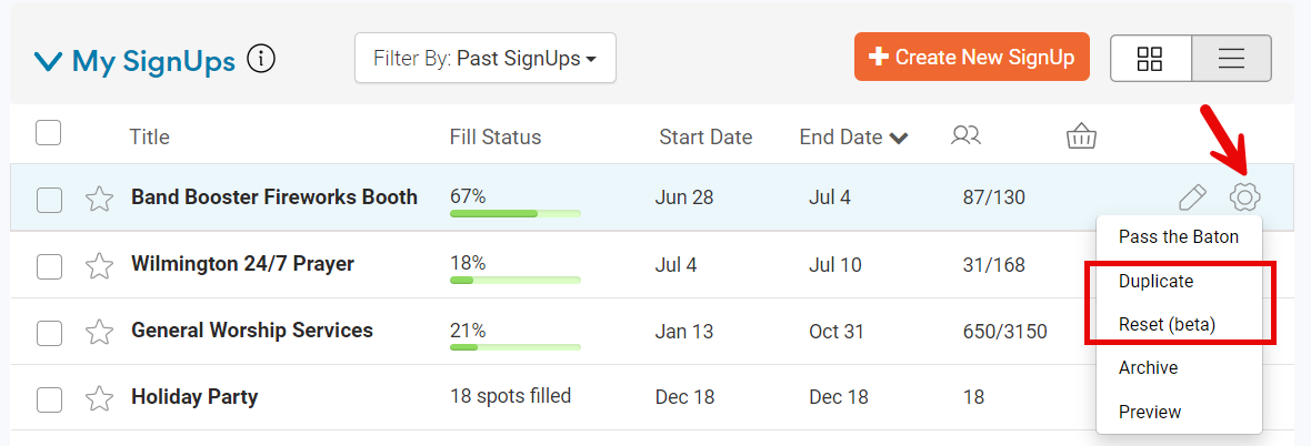 - On a large-screen device, log in and navigate to the Dashboard tab. Under the My SignUps area, locate your SignUp. If needed, use the Filter By drop-down menu at the top to view Past SignUps or access Archived SignUps to restore them.