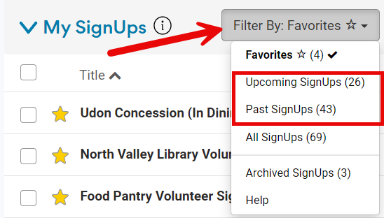 1. Login and go to the My SignUps area of your Dashboard or Organize tab to find your SignUp. (If you can't find the SignUp you are looking for, change the Filter By option at the top of the page to show 'Past SignUps' or 'Archived SignUps'.)
