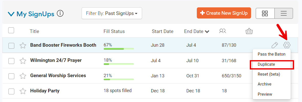 NOTE: If you have multiple years planned on the past SignUp, do NOT use Duplicate, unless you delete all but one year planned dates. If you need to delete a previous year's dates first, please see: How do I delete days with in my SignUp?