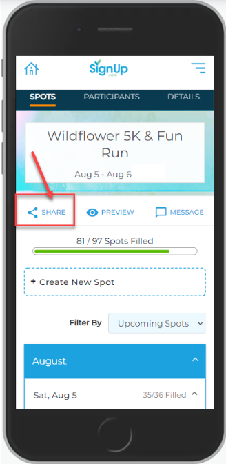 If you are using a mobile device, you will click on the SignUp Title  under My SignUps, then choose Share: