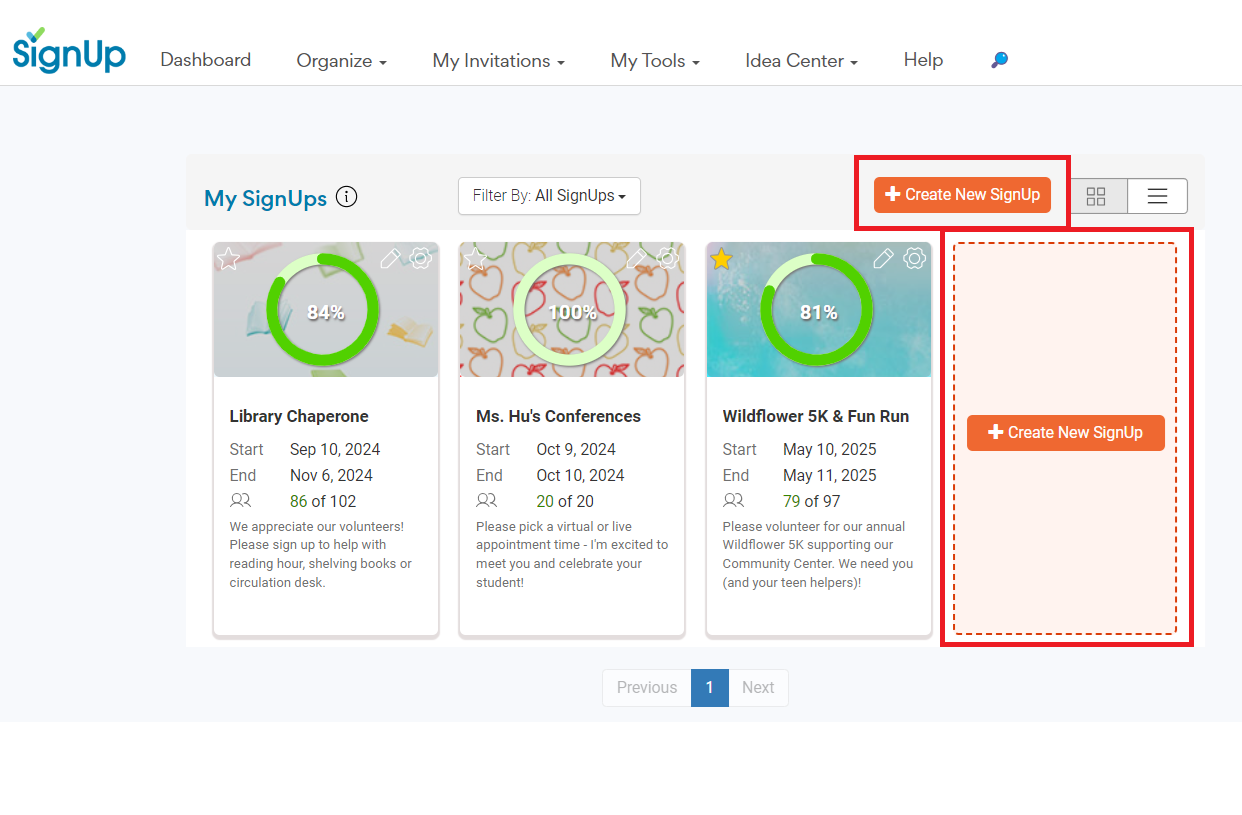 1. Login and on your Dashboard screen, select the card or button to Create New SignUp