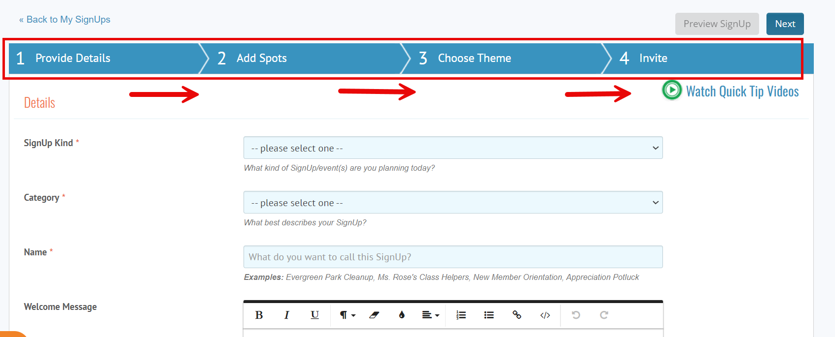 The SignUp Planning Wizard (also called Planning Steps) are what we call the first 4 planning steps when you set up your SignUp to get it ready for Participant access. You must complete all 4 steps in the Planning Wizard before you can invite people to sign up or add Assistant Organizers.