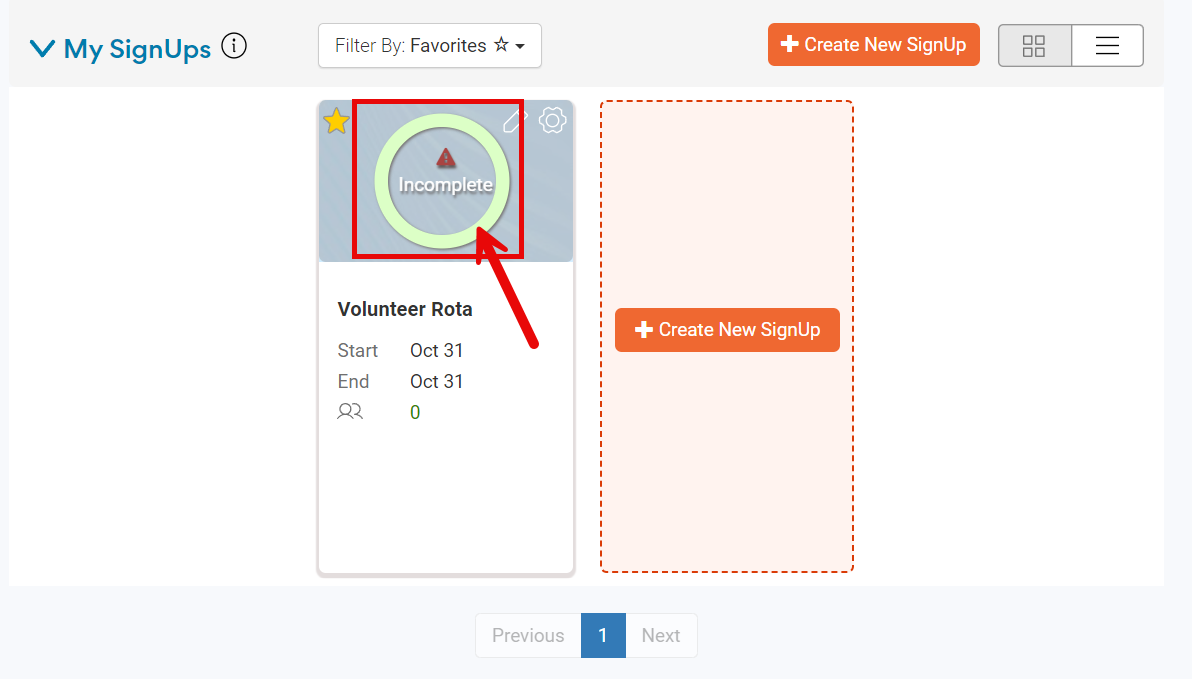 If your SignUp has the Incomplete warning, simply click the green circle to go back to the Planning Wizard then click Next at the top of the page to finish the final steps. Once all steps are complete you may invite Participants to sign up.