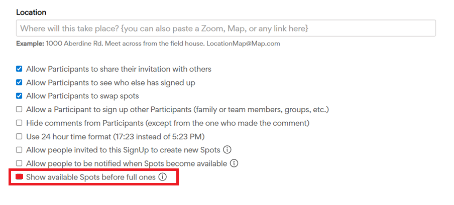 Would you like your Participants and Supporters to see available Spots right away? Simply check the "Show available Spots before full ones" option in the Details tab and Full Spots will be automatically sorted to the bottom of the list of Spots with similar times.